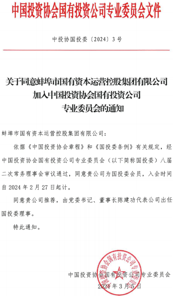 熱烈祝賀蚌埠市國控集團(tuán)加入中國投資協(xié)會(huì)國有投資公司專業(yè)委員會(huì)